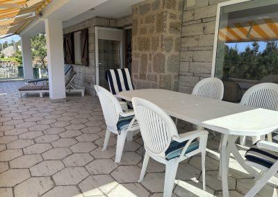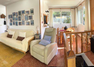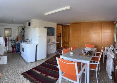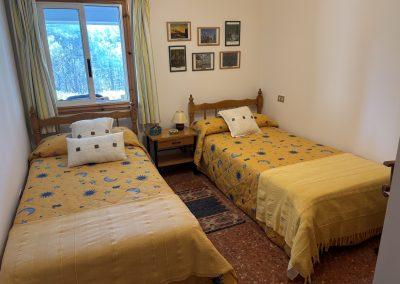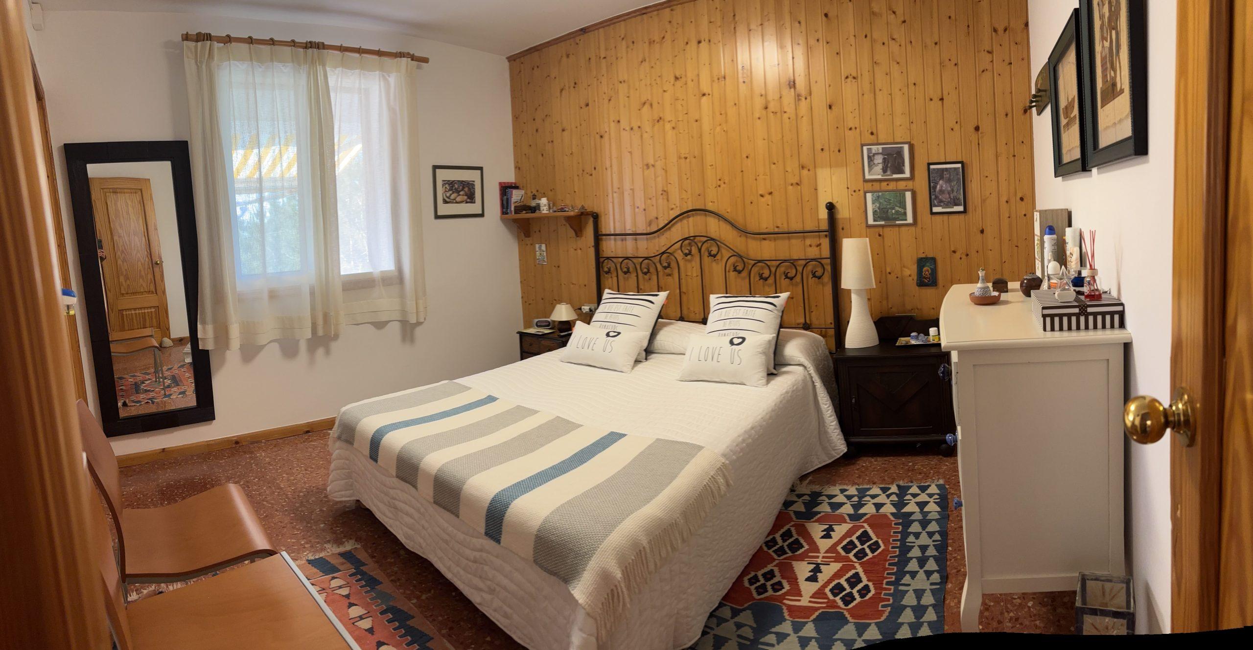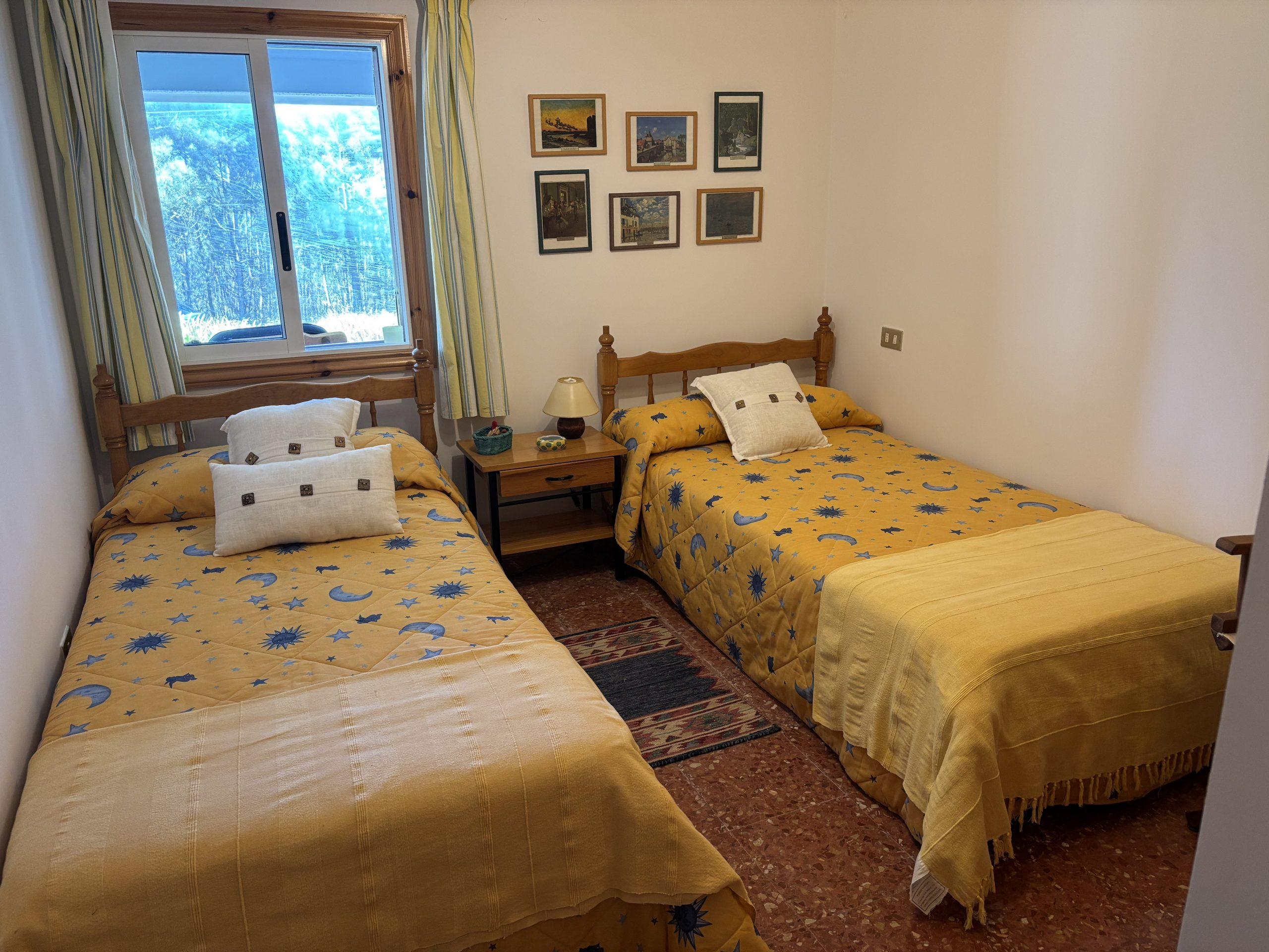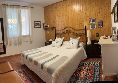 Chalet adosado de 3 plantas con capacidad máxima para 10 personas. En la planta baja contamos con 2 dormitorios, cuarto de lavadora y bodega/garaje, en la primera planta se ubica la cocina, salón-comedor y 1 baño y en la segunda planta, 3 dormitorios con 1 baño. Accesible mediante escaleras. Cuenta además con una zona ajardinada y un patio trasero muy acogedor, donde se ubica la barbacoa y una amplia mesa y bancos de piedra bajo una pérgola de madera para disfrutar de las comidas al aire libre.